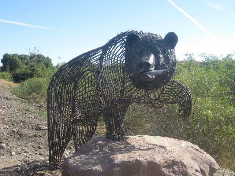 Grizzly with Salmon. Life size, Fabricated Metal Sculpture. Corten steel.