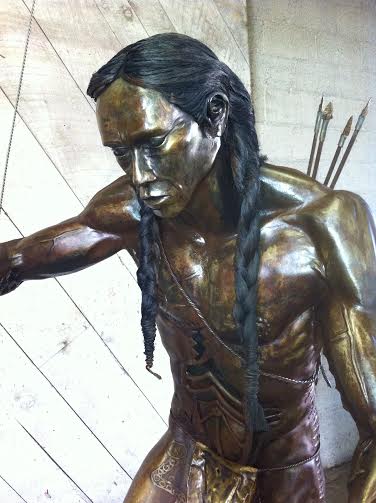 Paiute Warrior, Fabricated Metal Sculpture, 7 ft, Policlitus, rusted and oiled, copper hair blackened, ready for display.